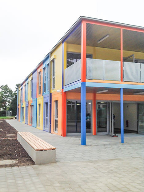 Aufgrund der Nähe zum bestehenden Hauptgebäude, kann an die vorhandene Heizungsanlage angeschlossen werden. Die Zufahrt zum Baufeld erfolgt über die Waldmeisterstraße über eine vom Generalunternehmer zu errichtende Toranlage. Die Anlage ist schlüsselfertig als modulares Raumsystem einschließlich folgender Leistungen zu errichten: