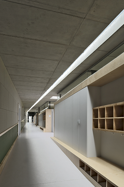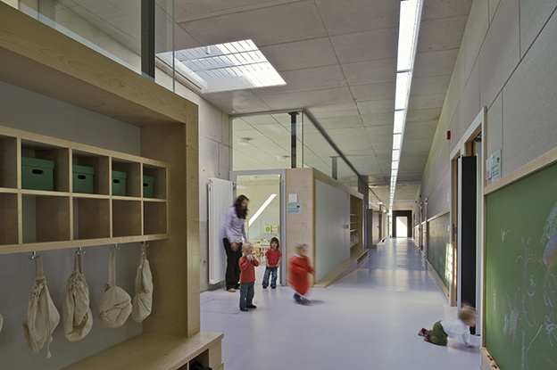 Decken und Wände sind aus Sichtbeton mit Kerndämmung. Der Innenausbau besteht im Wesentlichen aus den Garderoben- und Schrankanlagen der Trennwand zwischen den Gruppenräumen und dem als geneigte Rampe ausgebildeten Flur. Unter diesem ist die Haustechnik im zentralen Bodenkanal geführt. Die Raumakustik in den Räumen ausschließlich mit harten Oberflächen hallt zu lange nach. Es werden Dämpfelemente nachgerüstet. Die erst im zweiten Anlauf gefundene Auftragnehmerin für die Holz-Glas-Fassade meldet Insolvenz an. Die Nachfolgerin führt die Arbeiten zum Abschluss.