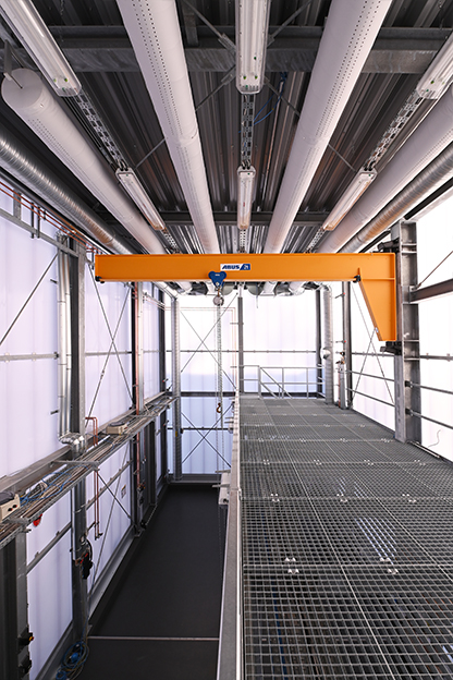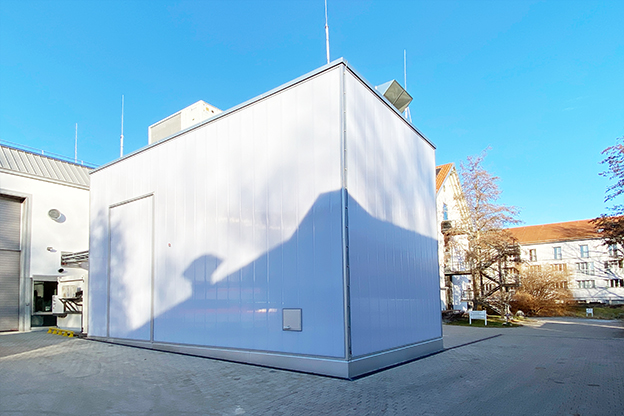 Die Fassade wurde aus Polycarbonat-Lichtbauelemente (LBE) mit Nut- und Federverbindung mit einer Breite von 50cm und einer Höhe von ca. 7.60m erstellt. Die Halle wird über eine große, 2-flg Stahltüre erschlossen. Eine zweite, kleine 1flg. Stahltüre mit Oberlicht dient als 2. Fluchtweg. In der Fassade West befindet sich eine Einbringöffnung für großes Forschungsgerät. Für größere Durchdringungen der Fassade wurden Aluminium-Paneele eingesetzt.