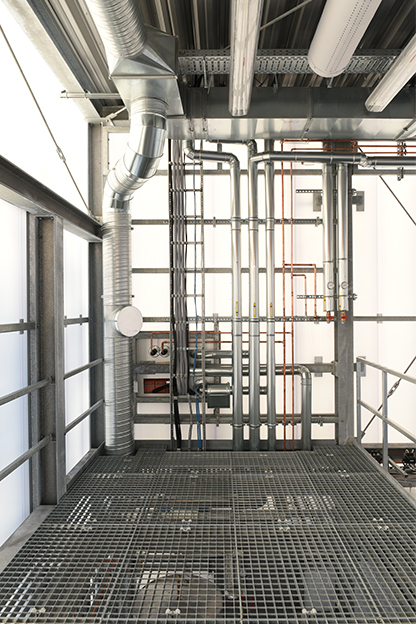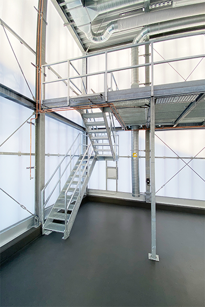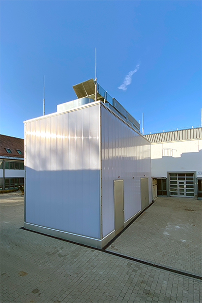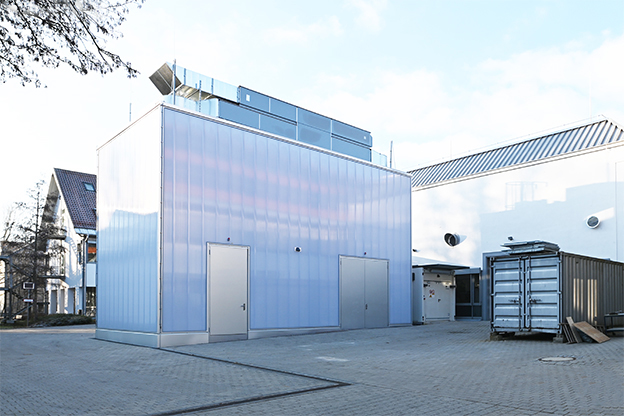 Der Neubau für das Fraunhofer Institut IVV in Freising wurde senkrecht zur Bestandshalle auf einem bereits vorhandenen Betonfundament im Wirtschaftshof errichtet. Über eine kleine Brücke aus Stahl werden die Medien in die neue Halle geführt. Bei dem Gebäude handelt es sich um eine zweigeschossige, multifunktionale Demonstrationsanlage zum Recycling von komplexen Kunststoffabfällen.