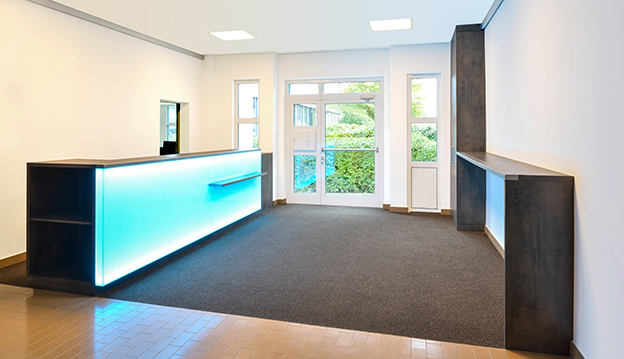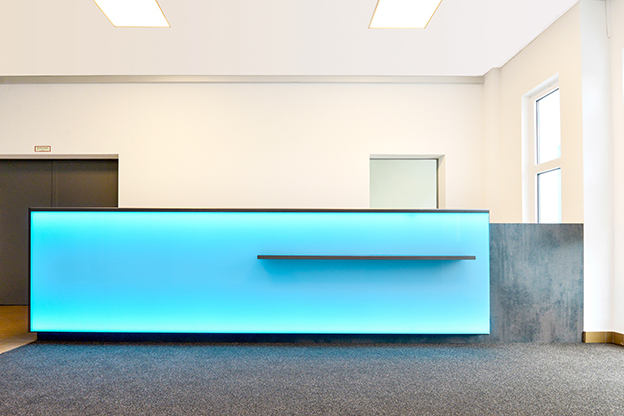 - Eingangstresen aus Glas (ESG Sicherheitsglas), Edelstahl, Plattenmaterial (Brandschutzklasse A2)