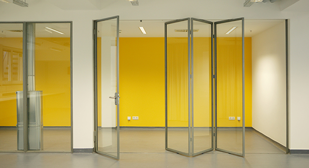 Der Konferenzraum erscheint in warmen Gelb mit langen Vorhängen. Die Oberlichten werden in feuerbeständiger Ausführung erneuert. Die Sprinkleranlage des Gebäudes wird ergänzt.