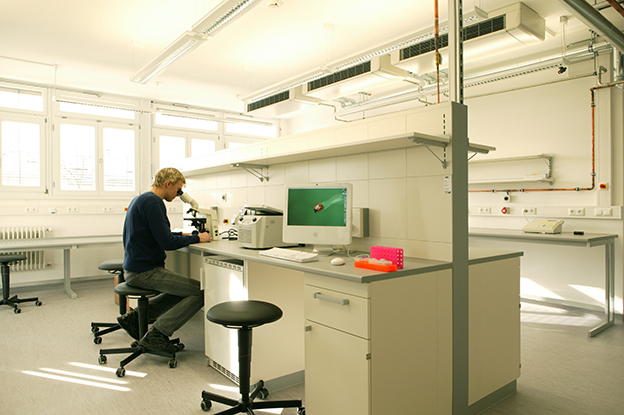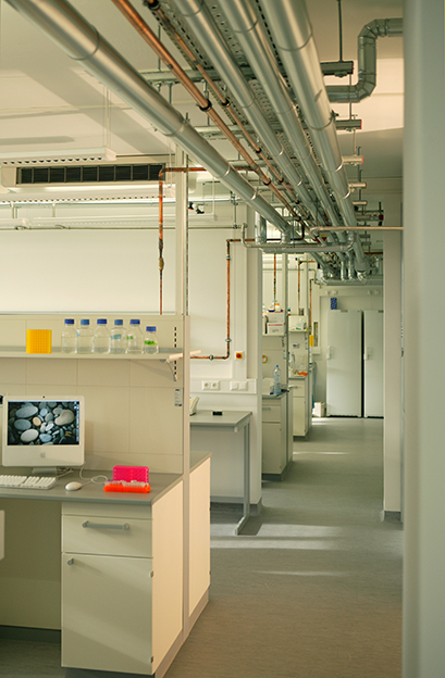 Alle Nutzungsbereiche beherbergen nun Laborräume, Zellkultur, Bakterien- und Mikroskopierraum, Chemikalienlager, Dunkelkammer, Waschküche, Büros und einen Aufenthalts- und Schulungsraum. Auch sämtliche technisch notwendigen Medien wie Gase, Wasser, Vakuum, Lüftung und Kühlung wurden vorgesehen. Laborabzüge wurden eingebaut. Die Leitungen sind offen in Trassen und Kabelkanälen installiert. Dadurch entstand ein hoch flexibles und nachrüstbares System, welches den verschiedensten Anforderung der Forscher gerecht wird, auch in Zukunft.