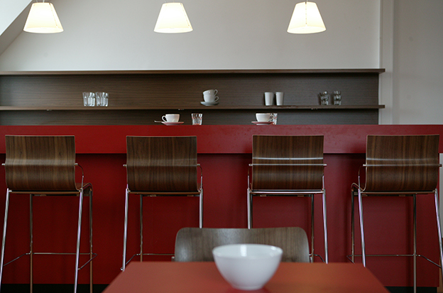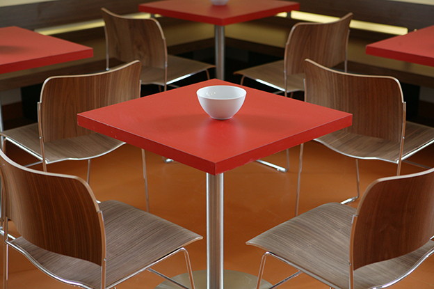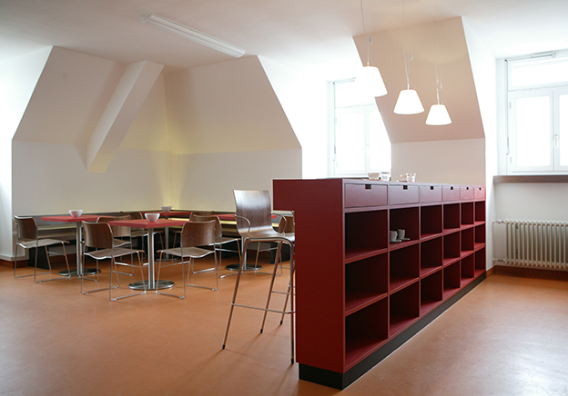 Die Arbeitsplätze bestehen aus frei stehenden und entlang der Wand angeordneten Laborbänken, denen Schreibarbeitsplätze zugeordnet sind. Die Forschungsräume sind in einer zurückhaltenden, hellen Materialität konzipiert. Im Kontrast dazu steht der in warmen, kräftigen Farben und Oberflächen gestaltete Aufenthaltsraum, der den Mitarbeitern das Entspannen in wohnlicher und angenehmer Atmosphäre ermöglicht.