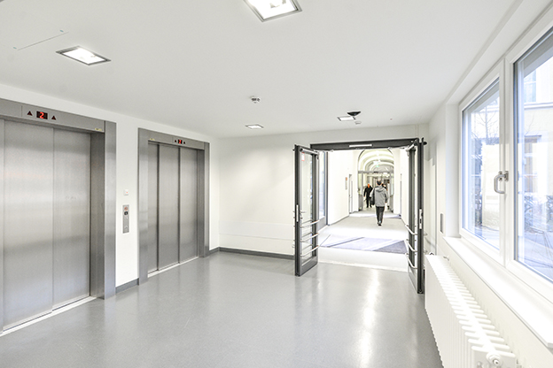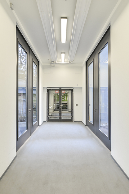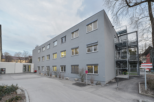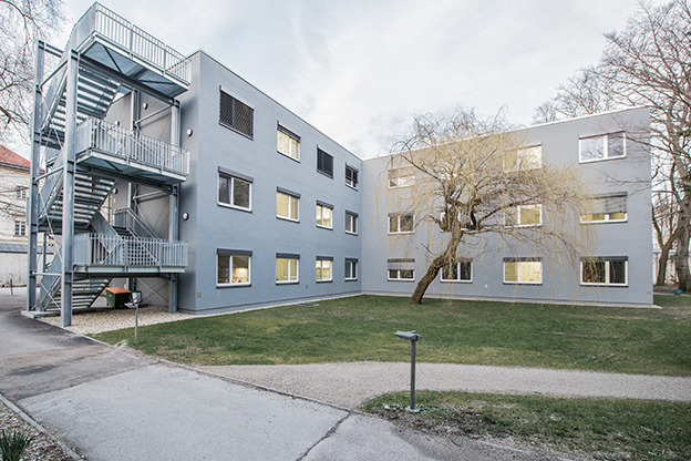 Der Baukörper erhält 3 Geschoße (E+2). Eine Anbindung erfolgt nur im Erdgeschoß. Der Modulbau erhält zwei unabhängige Treppenhäuser (eines integriert und eines als reines Fluchttreppenhaus) und einen Bettenaufzug in der Standardgröße 2.500kg mit 1,80 x 2,70m. Fahrstrecke EG bis 2.OG. Der Baukörper ist in den vorgesehenen Aufstellbereich so zu integrieren, dass die Eingriffe in die Grünstruktur des Geländes minimiert werden. Hierzu wird ein bestehendes, eingeschoßiges Entsorgungsbauwerk abgerissen.