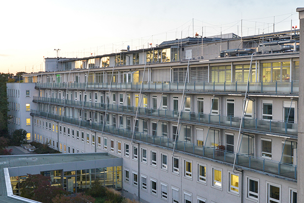 Durch die verschachtelten Klinikbauten gestaltet sich die Gerüststellung sehr schwierig. Auch die Arbeiten während dem laufenden Klinikbetrieb, die direkte Nachbarschaft zum Hubschrauberlandeplatz sowie die Bauzeiten in Herbst und Winter komplizieren die Bauarbeiten und erhöhen den Bauleitungsaufwand.