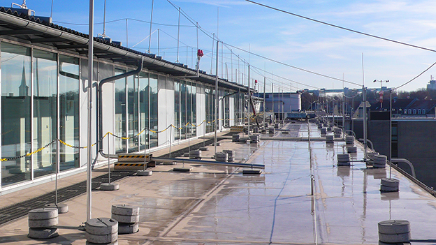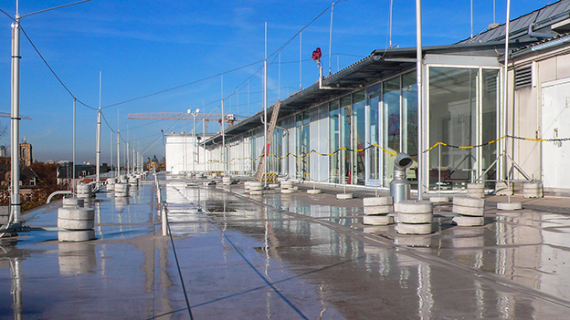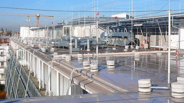 Im Zusammenhang mit neuen Anforderungen an den baulichen Wärmeschutz sind in der sanierungsbedürftigen Bausubstanz des Gebäudes 501 verschieden Maßnahmen erforderlich. Insbesondere der Flachdachaufbau im Dachgeschoß muss energetisch saniert werden. Maßgeblich hierfür sind die gesetzlichen Vorgaben der Energie-Einsparverordnung 2009. Dazu wird der gesamte Dachaufbau abgebrochen und erneuert. Wegen geringer Anschlusshöhen zu aufsteigenden Bauteilen muss auf einen üblichen Dachaufbau mit Kiesschicht verzichtet werden. Somit wird der neue Dachaufbau, bestehend aus drei Schichten mineralischer Dämmung sowie Kunststoffdachabdichtungsbahnen, auf der Rohdecke verklebt ausgeführt. Im Zuge der Sanierung werden Brandschutzmängel behoben und die neue Dämmung nicht brennbar ausgeführt.
