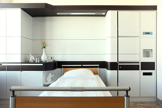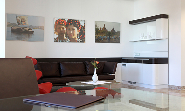 Die Aufgabe besteht darin, im bestehenden Neubau einen exklusiven Innenausbau herzustellen. Den Ansprüchen an Qualität, Gestaltung, Funktionalität und nicht zuletzt Hygiene wird man gerecht, indem ein multifunktionales Möblierungskonzept entwickelt wird, welches alle notwendigen medizintechnischen Geräte integriert und unsichtbar werden lässt. Eine edle und zugleich pflegeleichte Oberfläche wird durch den Einsatz von hochglänzendem Schichtstoff mit einer Bänderung von Wenge-Dekor erzielt. Ein besonderes Detail sind die abgerundeten Ecken.