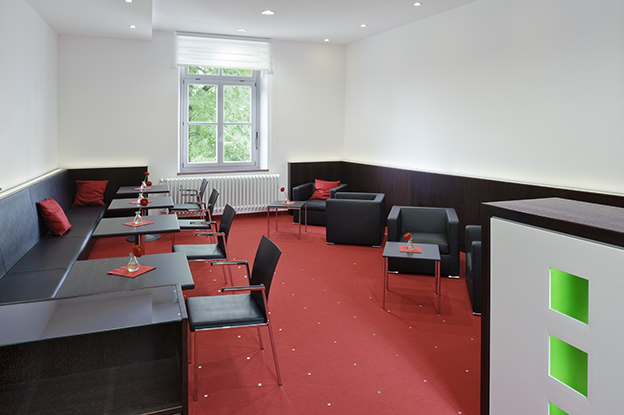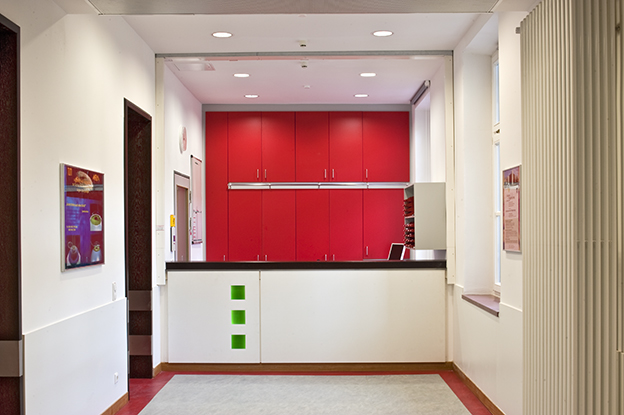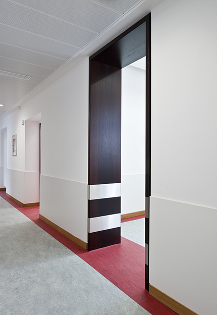 Die Farbe Rot ist Erkennungsmerkmal des Gebäudes im Leitkonzept von MRI. Angewendet an Boden und Wand fügt sie sich in die historische Altbausubstanz ein und hilft Sehbehinderten bei der Orientierung. Die Brandschutzertüchtigung der Holzbalkendecke auf Basis eines von sitzberger,hoyos architekten erstellten Brandschutzkonzepts, sowie die statische Ertüchtigung der Gebäudestruktur stellen eine besondere konstruktive Herausforderung dar.