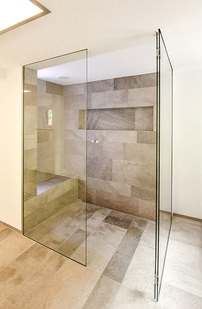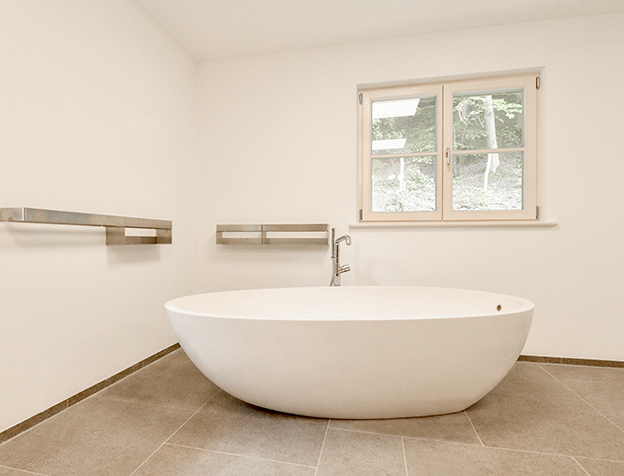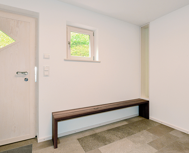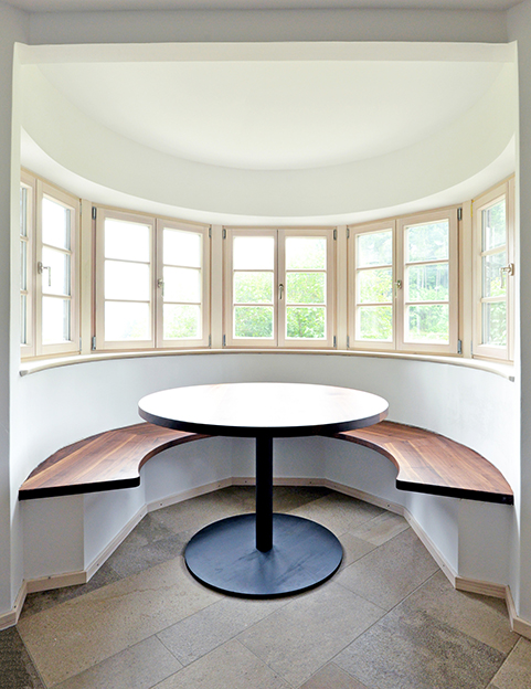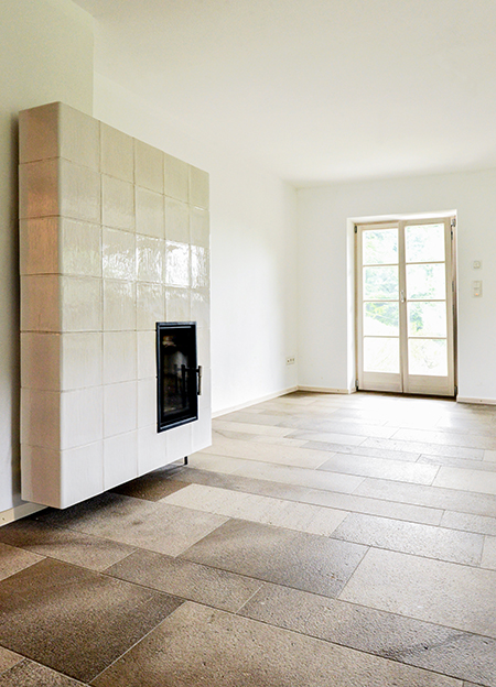 Das Landhaus stammt aus dem Jahre 1937 und befindet sich in Hanglage mit direktem Blick auf den Tegernsee. Das Gebäude wurde weitestgehend bis auf die Grundsubstanz entkernt. Aufgrund der mangelhaften Bausubstanz bedurften Wände sowie Holzbalkendecken einer statischen Ertüchtigung. Durch den Abbruch von Wänden im Erdgeschoß sowie Obergeschoß wurde eine offenere Grundrissgestaltung erreicht. Aufgrund der Hanglage ist das Gebäude nur zur Hälfte unterkellert. Für die neuen Sanitär- und Elektroleitungen wurde ein Kanal unterhalb der neu betonierten Bodenplatte im nicht unterkellerten Bereich erstellt. Bäder, Küche sowie Fenster, Türen und Oberflächen wurden komplett erneuert. Das Erdgeschoß wurde einheitlich mit dem Naturstein Krensheimer Muschelkalk und Fußbodenheizung ausgestattet. Im Obergeschoß wurden großteils neue, geölte Fichtendielen verlegt. Fenster, Türen sowie Fußbodenleisten wurden in weiß lasiertem Holz ausgeführt. Um den innen liegenden Treppenraum mit Tageslicht aufzuhellen und Blickbeziehungen zu schaffen wurden Festverglasungen in die Innenwände integriert. Im Esszimmer wurde ein Kachelofen aus handgefertigten Kacheln eingebaut. Die Sitznische im Erker wurde mit neuen Möbeln aus Nussbaumholz und brüniertem Stahl ausgestattet.