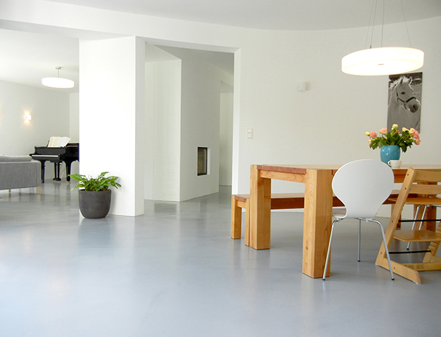 Eine zementgebundene Bodenbeschichtung (Pandomo) wurde im Erdgeschoß beim Wohn- und Essbereich, der Küche, dem Flur und im Hauswirtschaftsraum als Nutzschicht auf den bestehenden Zementestrich verlegt. Im Oberschoß war es erforderlich im Bereich der wieder verschlossenen Deckendurchbrüche das Fertigparkett (Schiffsboden Elementgröße 70x500mm) aus amerikanischer Kirsche zu ergänzen bzw. anzuarbeiten. Im Unterschoß wurde im Bereich Flur, Kletterhalle und Fitness ein neuer Lino verlegt werden.
