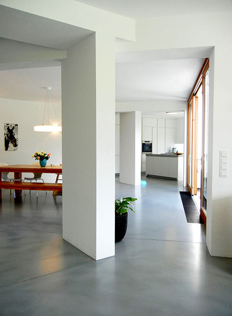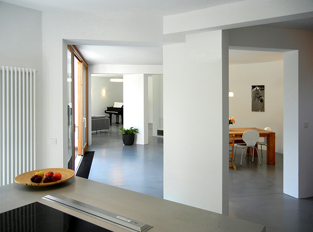 Beim Bauvorhaben handelt es sich um den Umbau von einem Einfamilienhaus Am Buchet 7 in Icking. Das Objekt ist bereits im Jahre 2005 durch sitzberger,hoyos architekten vollständig saniert worden. In der nun ausgeführten Baumaßnahme war das Ziel eine offenere Grundrissgestaltung zu erreichen. Dies wurde durch den Teilabbruch der Wände zwischen Küche und Flur (nichttragend) sowie Wohn- und Esszimmer (tragend) erreicht.