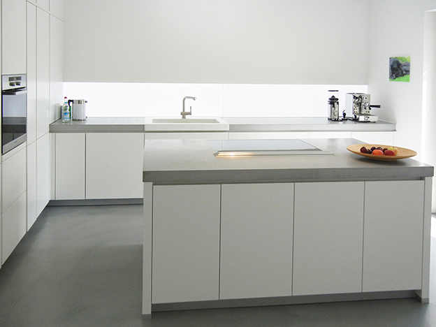 Die neue Küche ist in schlichtem Weiß gehalten. Die Arbeitsplatte wurde aus Beton gefertigt und passt sich somit an die Gestaltung der Bodenbeschichtung an.