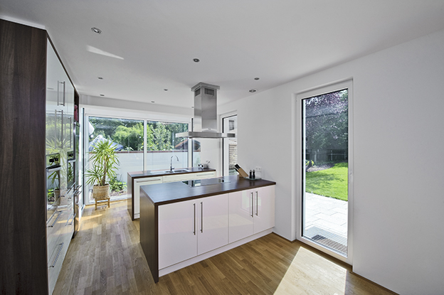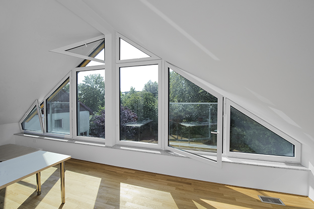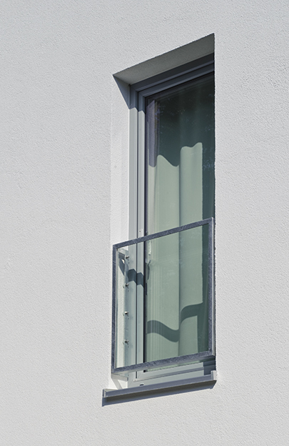 Raumhohe Verglasungen an der Südseite sowie im Dachgeschoßbereich bilden ein lichtduchflutetes Raumklima. Als Absturzsicherungen wurden schlichte Glasbrüstungen bündig in die Fassade gesetzt. Dem Küchenbereich der südlichen Wohneinheit wurde ein Erker in Stahl-Glas-Konstruktion angefügt, wodurch sich der Innenraum mit dem Außenraum verbindet.