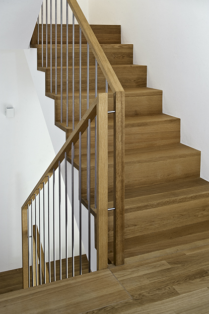Die Wohnbereiche sind mit einem geölten Eichenparkett ausgestattet, die Nassbereiche mit großformatigen, grauen Steinzeugfliesen.